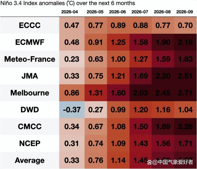 厄尔尼诺指数图开始发黑,超级厄尔尼诺成员确定增多!分析:还需观察 春季预报障碍待验证 厄尔尼诺指数图开始发黑,超级厄尔尼诺成员确定增多!分析:还需观察 春季预报障碍待验证!近期,一张最新的Niño 3.4指数预测异常分布图在气象界引起了广泛关注。这张汇集了全球多个顶级数值预报中心模拟结果的表格显示,随着时间推移,代表未来海温异常预测的格子颜色正由浅红向深红乃至黑色迅速加深。这表明在全球海温已经处于高位的情况下,一股更为强劲的厄尔尼诺暖流正在酝酿。4月11日发布的这份预测报告中出现的黑色区块,预示着超级厄尔尼诺事件的发生概率极高。在4月11日发布的预测数据中,Niño 3.4指数(衡量厄尔尼诺强度的核心指标)在2026年下半年的预测值普遍上调。根据日本气象厅、ECMWF以及墨尔本气象局提供的最新数据,2026年8月和9月的预测均值已经突破了2.0°C的临界大关,部分数值甚至达到了2.71°C。在气象学色标中,当预测值超过2.0°C且颜色呈现为深红发黑时,通常预示着超级厄尔尼诺的发生概率已从可能性转变为高度确定性。这种指数图发黑的过程,本质上是全球海洋热含量累积到临界点后的剧烈释放。4月11日的综合平均值显示,到2026年9月,全球各大主流机构的预测平均值已达1.87°C。这种多机构预测的一致性,并非模型计算的偶然,而是基于当前太平洋赤道海温已经观测到的持续上升态势。当海温异常达到这种深度发黑的级别,大气环流将发生剧烈的结构性重组,沃克环流的减弱或崩溃将直接改变全球水汽的分配格局。观察4月11日的这份表格可以发现,虽然德国气象局等少数机构在4月份尚维持较低的异常波动,但绝大多数核心成员如美国国家环境预报中心、意大利地中海气候中心等,均已在2026年6月之后将预测值推高至1.0°C以上。这种一致性增强,是气象预报中信心度提升的重要标志。当这种深色调在预测图上连成一片,它宣告了超级厄尔尼诺的潜在规模可能超过以往。
